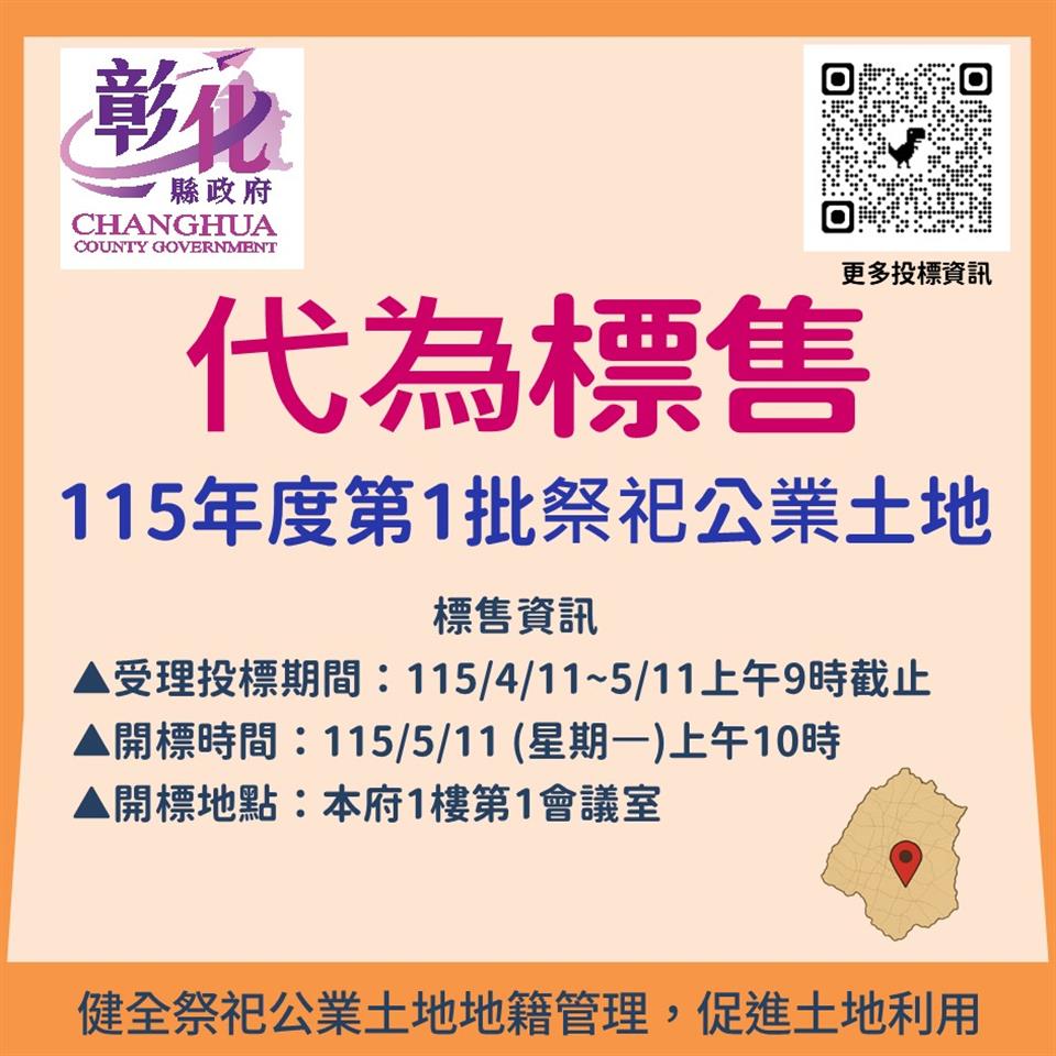 新聞焦點 彰化縣政府代為標售115年度第1批祭祀公業未能釐清權屬土地開始公告 發布日期 2026/02/28~2026/05/11 | 發佈單位: 民政處宗教禮俗科 | 發佈日期: 黃小姐 7531715 | 更新日期 2026/02/26 | 瀏覽人數: 22人 彰化縣政府代為標售115年度第1批祭祀公業未能釐清權屬土地,已於115年2月11日開始公告至115年5月11日止,受理投標期間為115年4月11日起至115年5月11日上午9時止,並訂於115年5月11日(星期一)上午10時在本府1樓第1會議室辦理開標作業,本次共公告14標土地,歡迎有意投標且符合投標資格的民眾踴躍參與投標,以免向隅。 本次標售中,底價最低者為第22標「埔鹽鄉東榮段2117-0002 地號」,底價為13萬8,240元。該土地屬特定農業區農牧用地,面積54平方公尺,權利範圍為1/1,折算每平方公尺單價為2,560元。此外,該標的位置與第18標「埔鹽鄉東榮段2114-0000 地號」、20標「2116-0000 地號」及21標「2117-0000 地號」3筆相鄰。而本次標售底價最高1,091萬3,790元係第5標「伸港鄉伸南段0120-0000地號」,為農業區用地、面積2,802平方公尺、權利範圍全部,每平方公尺3,895元,另此標為合計標售,含伸南段0107-0000地號,標售底價180萬7,014元,為農業區用地、面積484平方公尺、權利範圍全部,每平方公尺3,733.5元,合計標售底價為1,272萬804元。 祭祀公業未能釐清權屬土地清理主要係為健全祭祀公業土地地籍管理,促進土地利用,經公告期滿三年無人申報、經申報被駁回,屆期未提起訴願或訴請法院裁判及經訴願決定或法院裁判駁回確定之土地,除公共設施用地外,由本府辦理代為標售。 民政處表示,提醒有意投標人,本次各標號土地多有占用情形,標售一律按現狀標售,其地上物及一切應辦手續或占用之排除,概由得標人自理,欲參加投標之民眾可向本府民政處免費索取投標書件,亦可至本府民政處網站(https://civil.chcg.gov.tw/)下載使用。另外,各標號土地權利人及利害關係人於決標前,仍可檢具相關證明文件,向彰化縣各公所申報清理祭祀公業並暫緩標售,或有符合規定之優先購買權者,請主動於決標後10日內書面申請主張優先購買權,以確保自身權益。