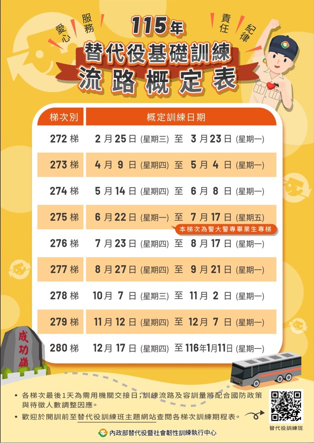 公告資訊 【公告】115年替代役預定入營日期 發布日期 2025/12/08~2026/12/20 | 發佈單位: 民政處兵役科 | 發佈日期: 邱介瑤 7531755分機1755 | 更新日期 2025/12/08 | 瀏覽人數: 107人 115年度替代役基礎訓練各梯次流路資訊出爐了~ 本年度內政部安排第272至280梯次,共9個訓練梯次,每梯次訓練天數為26天(含撥交日)。 請即將入營的役男和各位家長們,敬請留意入營時間、提前做好行程規劃! 第272梯次 02月25日(星期三) 第273梯次 04月09日(星期四) 第274梯次 05月14日(星期四) 第275梯次 05月20日(星期三)<警大專畢業生專梯> 第276梯次 07月23日(星期四) 第277梯次 08月27日(星期四) 第278梯次 10月07日(星期三) 第279梯次 11月12日(星期四) 第280梯次12月17日(星期四)