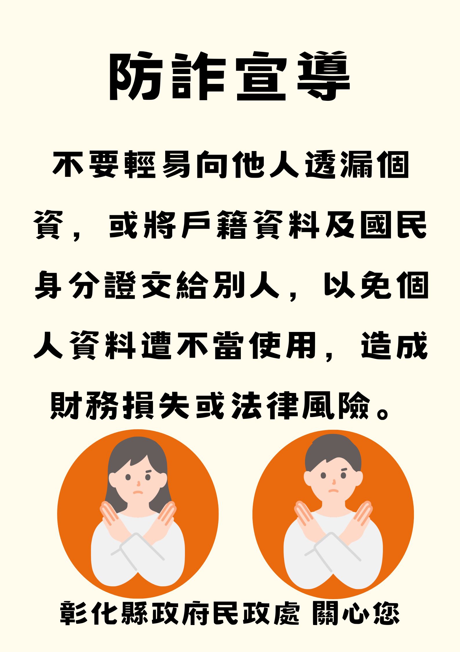 公告資訊 防詐宣導 發布日期 2026/02/24~2026/12/31 | 發佈單位: 民政處戶政科 | 發佈日期: 簡小姐 1745 | 更新日期 2026/02/24 | 瀏覽人數: 11人 ❗提醒❗提醒❗ . 🛎 不要輕易向他人透露個人資料,避免個資外洩 🛎 戶籍資料及國民身分證請妥善保管,切勿任意交付他人 🛎 防範詐騙,保障自身財產與權益 . 相關提醒:個人資料應審慎保護,以免遭不當使用,造成財務損失或法律風險 .
