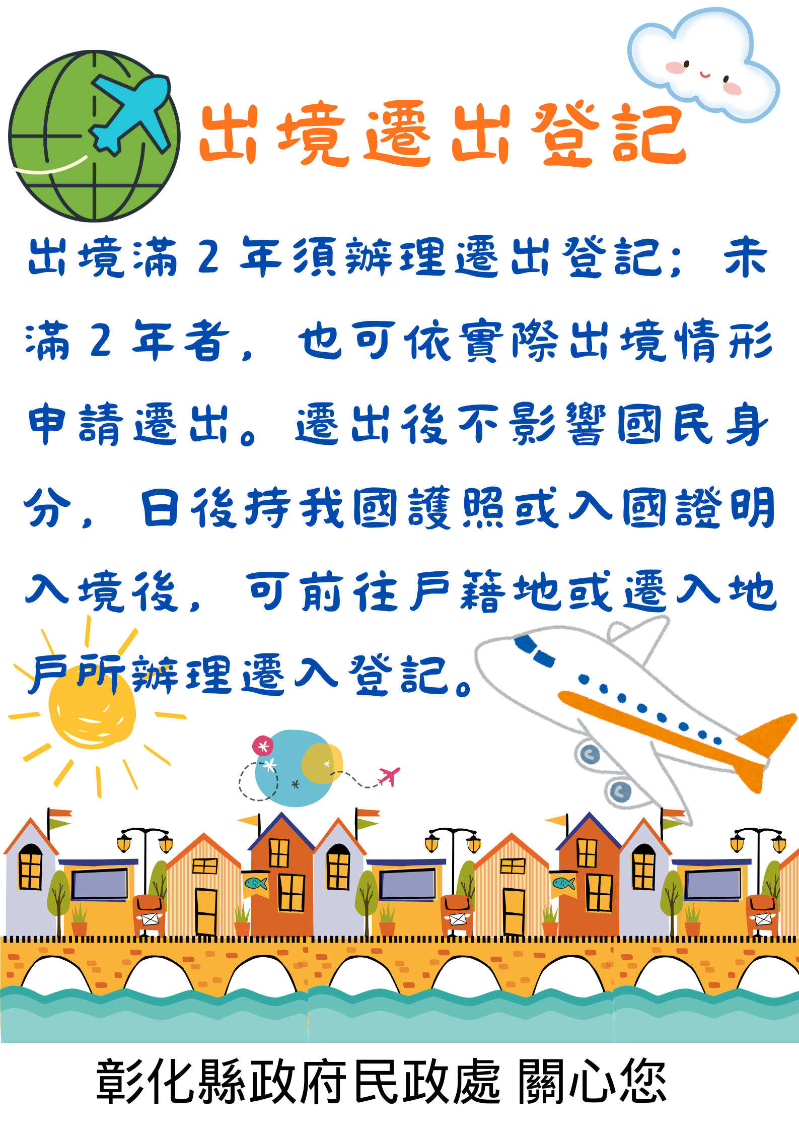公告資訊 戶政宣導-出境遷出登記 發布日期 2026/02/24~2026/12/31 | 發佈單位: 民政處戶政科 | 更新日期 2026/02/24 | 瀏覽人數: 9人 戶政宣導-出境遷出登記 ★國人出境2年以上應辦理遷出登記。 ★出境未滿2年,亦得依當事人出境事實申辦戶籍遷出登記。 ★戶籍遷出國外者,不影響當事人國籍。 ●適格之申請人 1.本人。 2.戶長。 3.受委託人。 4.未成年人以法定代理人為申請人。 ●辦理應備證件(均需正本) 1.當事人戶口名簿。 2.申請人國民身分證、印章(或簽名)。 3.委託他人辦理者,應檢附委託書、受委託人國民身分證、印章(或簽名)。 4.父或母單獨為未成年子女申辦,須提具另一方同意書。 5.應備證件在國外作成者,應經我駐外館處驗證;在大陸地區或香港、澳門作成者,應經行政院設立或指定之機構或委託之民間團體驗證。應備證件為外文者,應另檢附經駐外館處驗證或國內公證人認證之中文譯本。 ●受理戶政事務所 1.請至戶籍所在地戶政事務所辦理。 2.「出境遷出登記」得於內政部戶政司網站「網路申辦服務」線上申辦。 ►貼心小叮嚀 1.出境未滿(或已滿)2年:可由戶長、法定代理人或當事人申請戶籍遷出登記。 2.出境已滿2年:原在台設有戶籍,出境滿2年未入境之現戶人口,經戶政事務所依內政部移民署通報,通知戶長辧理戶 籍遷出逾期未辦,得由戶政事務所逕為辦理戶籍遷出登記。 3. 戶籍遷出者仍具有中華民國國民身分,不影響當事人國籍;只要持中華民國護照或入國證明文件入境後,另提憑國民身分證、戶口名簿或是單獨立戶證明文件(如房屋所有權狀、最近1期且已完稅之房屋稅單)等文件,至遷入戶籍地戶政事所申辦遷入登記。 ~~~彰化縣政府民政處 關心您~~~