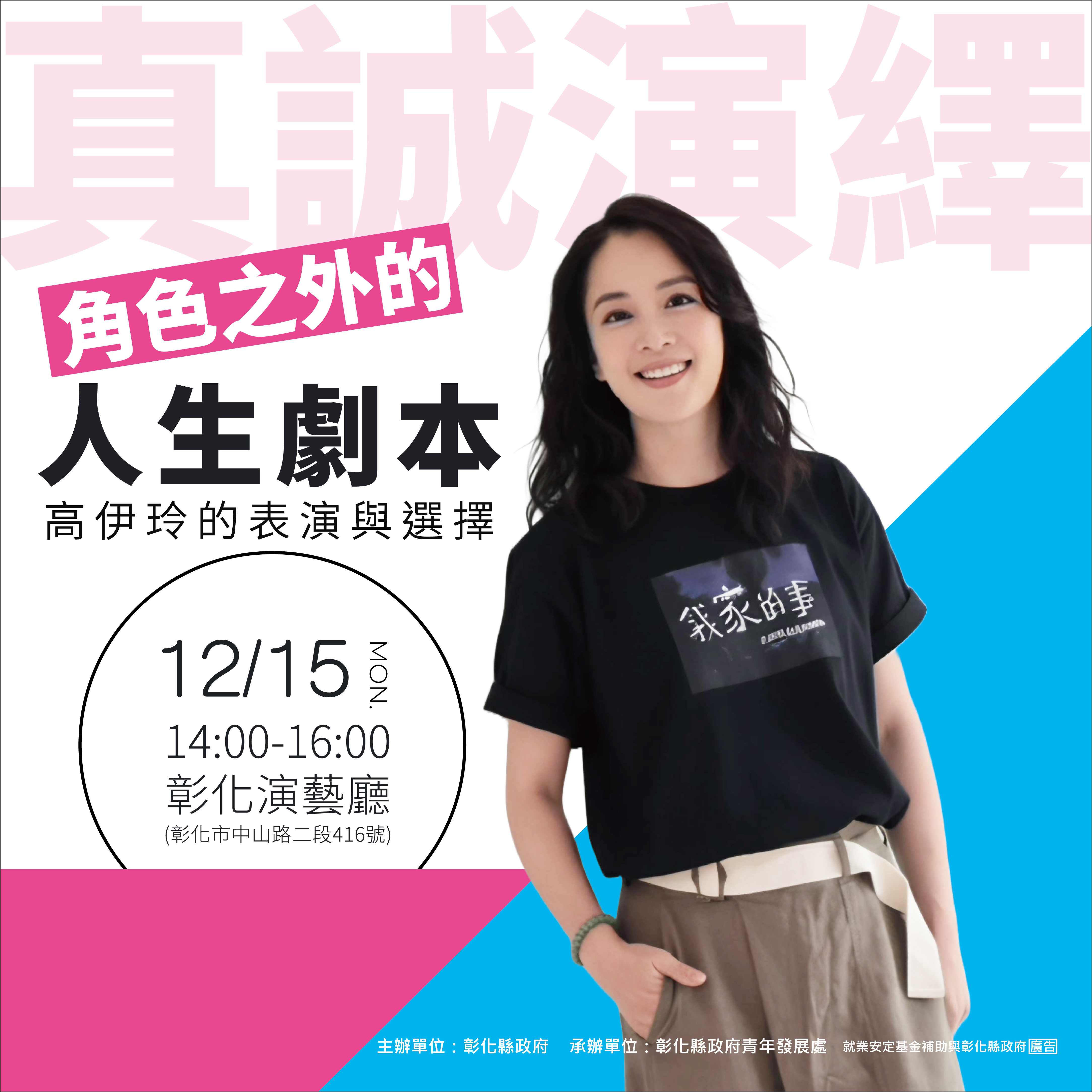 教育研習 《角色之外的人生劇本-高伊玲的表演與選擇》名人講座 發布日期 2025/11/24~2025/12/15 | 發佈單位: 青年發展處職涯發展 | 發佈日期: 職涯發展科 7121530 | 更新日期 2025/11/24 | 瀏覽人數: 29人 從品牌廣告演員,到電影鏡頭角色共情,高伊玲的職涯充滿張力! 這場講座將帶你「剪輯」出最動人的生命片段: * 📽️ 鏡頭一: 如何將角色的人生故事,化為深刻演技? * 🗺️ 鏡頭二: 當人生走到迷茫的荒野,你該如何找到下一條路徑? 主題|《角色之外的人生劇本-高伊玲的表演與選擇》 時間|114年12月15日(星期一) 14:00-16:00 地點|彰化演藝廳 (彰化市中山路二段416號) 🎁前300名報名成功、完訓後填寫滿意度問卷,可獲得小禮物 🖌️核予創業研習時數2小時