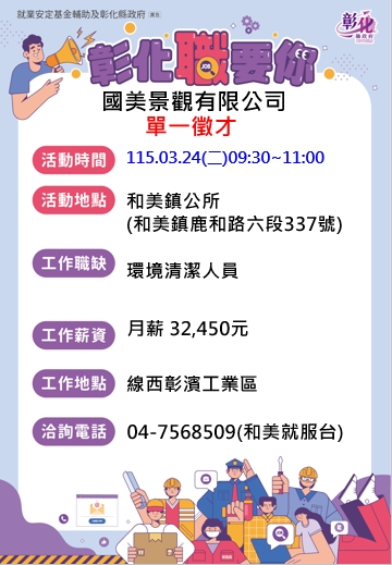 其他活動 🎉🎉🎉1150324國美景觀單一徵才活動!!!~和美鎮公所 發布日期 2026/03/12~2026/03/24 | 發佈單位: 勞工處就業服務科 | 發佈日期: 王靜儀 04-7568509 | 更新日期 2026/03/12 | 瀏覽人數: 13人 廠商名稱:國美景觀有限公司 時 間:115年3月24日(二) 09:30-11:00 地 點:和美鎮公所【和美鎮鹿和路六段337號】 職業名稱:環境清潔人員 工作內容:線西彰濱工業區道路、週邊、岸邊等環境清潔 工作薪資:月薪32,450元 休假制度:週休二日、國定假日休 雇用人數:5人 教育程度:不拘 洽詢電話:04-7568509