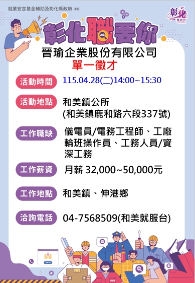 其他活動 📣📣【1150428單一徵才活動-晉瑜企業股份有限公司】~和美鎮公所 發布日期 2026/04/16~2026/04/28 | 發佈單位: 勞工處就業服務科 | 發佈日期: 王靜儀 7568509 | 更新日期 2026/04/16 | 瀏覽人數: 14人 🔆🔆廠商名稱:晉瑜企業股份有限公司 🕤活動時間:115年4月28日 星期二 14:00 ~ 15:30 🔅活動地點:和美鎮公所 【和美鎮鹿和路6段337號】 *️⃣職業名稱:儀電員/電務工程師、工廠輪班操作員、工務人員/資深工務 💰薪 資:月薪32,000-50,000元(非指單一職缺) 💰 💎公司簡介: 成立於民國83年,主要進口熟料、水淬高爐爐碴粉等原料研磨加工製成卜特蘭水泥、高爐水泥、爐石粉、爐灰粉等產品,總公司位於台北市,分別於八里、花蓮、宜蘭、彰化、高雄、觀音等地設有八個研磨廠,年營收逾30億元,資本額為新台幣12億元整。 💥福利制度: 年終獎金、專業證照獎金、員工宿舍、結婚禮金、部門聚餐、配發公務機、伙食津貼、員工團體保險。 ▶️工作地點:和美鎮、伸港鄉 ☎️洽詢電話:04-7568509 (和美就服台)